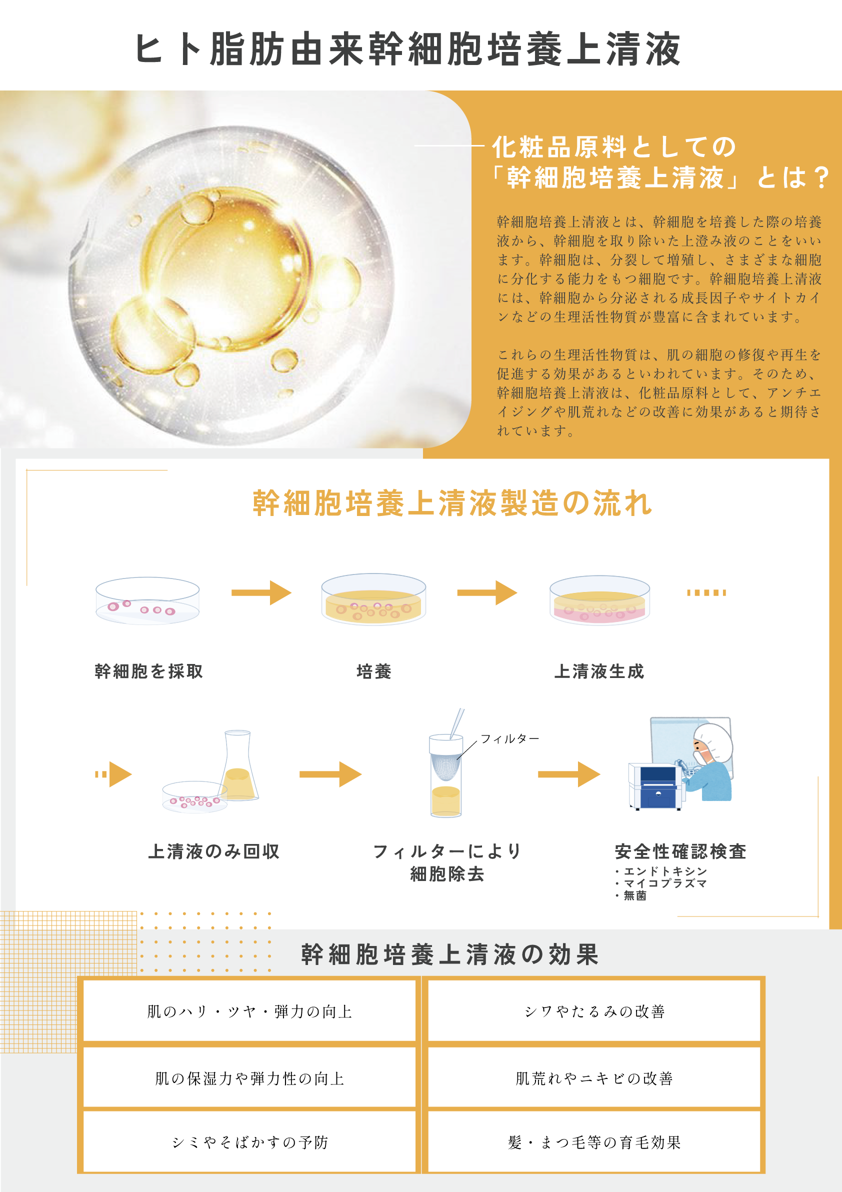 幹細胞培養上清液とは、体内に存在する脂肪など間葉系幹細胞と分類される幹細胞を培養し、その培養液から幹細胞を取り出して滅菌等の各種処理を行った液体(上澄み液)のことを言います。