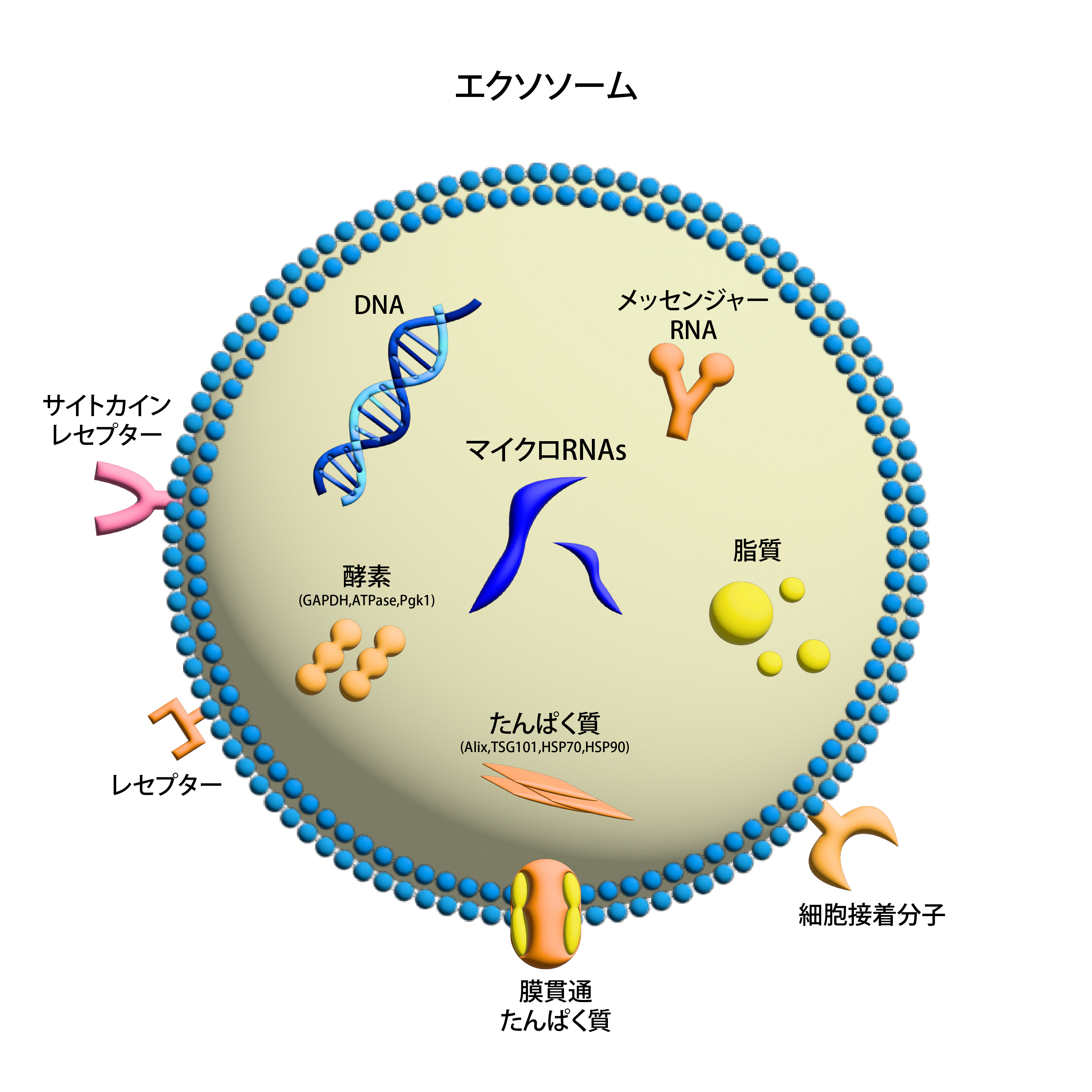 ・糖鎖:エクソソームの表面に存在し、細胞認識や免疫応答の調節に関与します。
